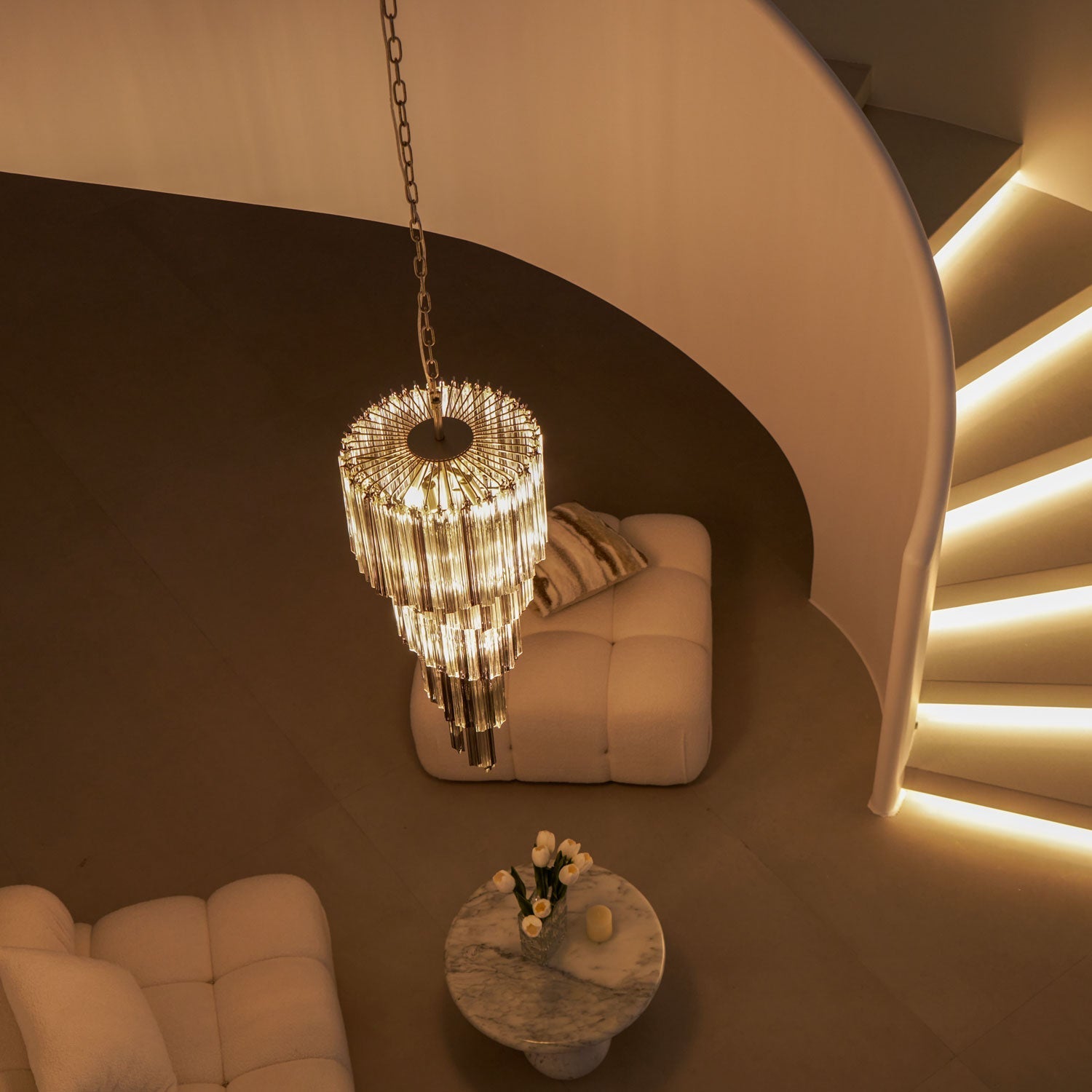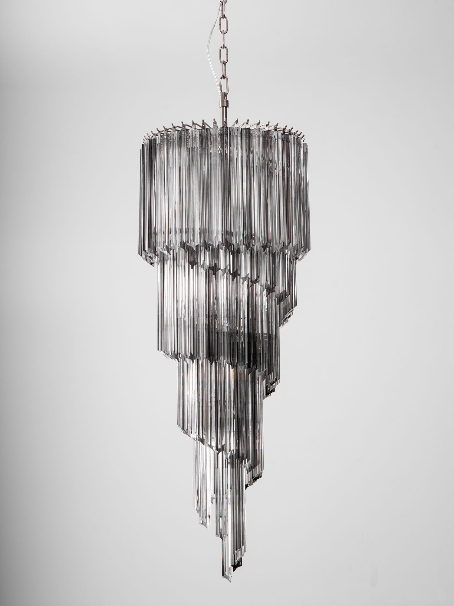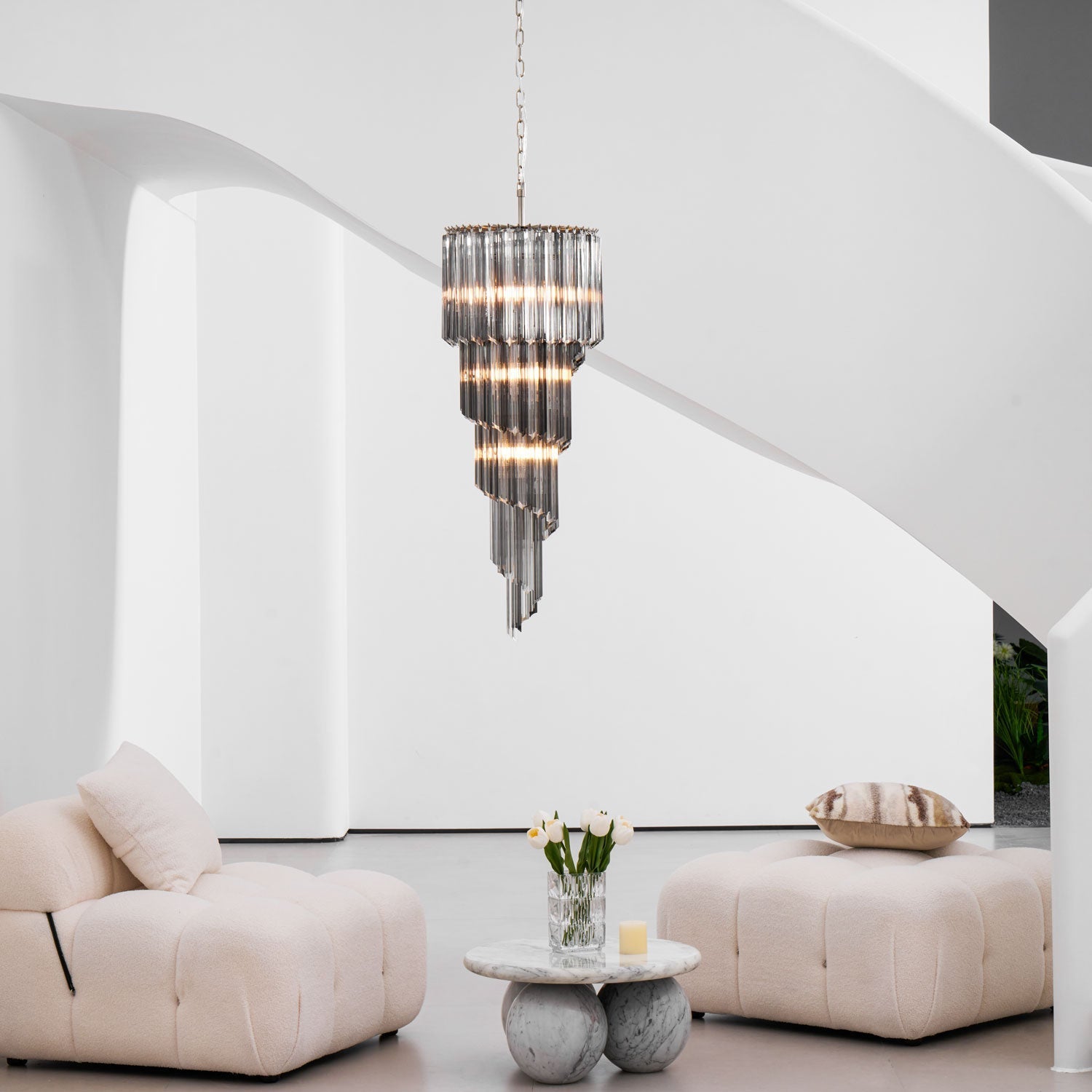 Dramatic elegance meets contemporary artistry in the Lucente Noir Spiral Chandelier from dekorfine. Crafted with layers of precision-cut Smoke Gray glass, this sculptural piece spirals downward in a dazzling cascade, creating a mesmerizing play of light and shadow. Perfect for grand foyers, staircases, or high-ceilinged living spaces, it transforms any interior into a space of bold sophistication.
